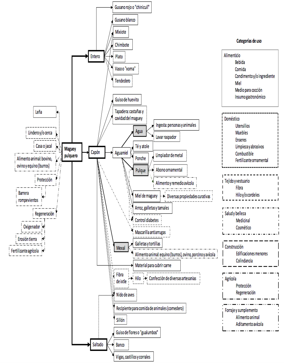 Se ha convenido exponer de manera esquemática la información antes descrita. En el siguiente diagrama se presenta el conjunto de usos registrados en Nanacamilpa y Cardonal. Se dispuso como punto de partida al maguey pulquero. De lado derecho de éste se muestran los beneficios de acuerdo al estadio de la planta, categorización (cada categoría está representada con un borde diferente) y orden de uso (los recuadros secuencialmente indican un nivel). De lado izquierdo se integran aquellos ofrecidos sin importar la etapa de vida del maguey. Algunos usos se sombrearon porque son productos neutros que caben en diversas categorías.