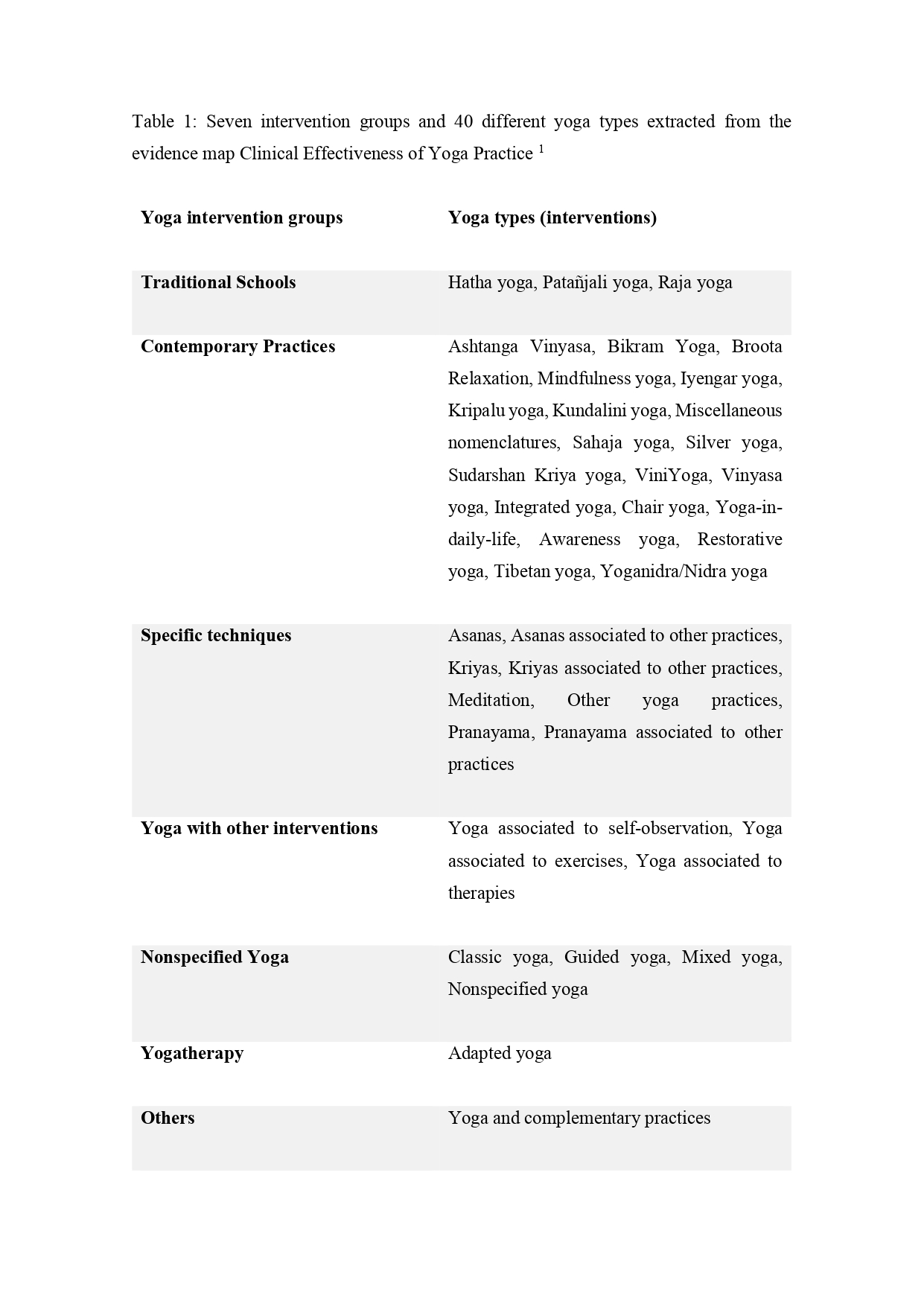 Evidence maps consist of systematic searches in certain fields and may be presented as graphs or searchable databases associated with a descriptive report outlining the evidence. They are used for different purposes such as: research, to identify evidence gaps, to evaluate the need for funding and for policy decisions (Sara and White, 2018; Miake-Lye, 2016). The reason for referring to this database is that, so far, few evidence maps on yoga, and only ones on specific diseases, have been published. This essay focuses mainly on the fact that in the 140 studies (2005-2019) included in the map, 40 different interventions, or types of yoga, were applied.