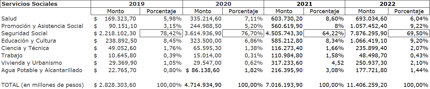 El rubro que acapara la mayor parte del total presupuestado es el de Seguridad Social, seguido por Salud y Promoción y Asistencia Social, superando este último la inversión en Salud recién en 2022. Los demás rubros alcanzan mínimos preocupantes. Los incrementos en Vivienda y Urbanismo y Agua Potable y Alcantarillado pueden, en parte, atribuirse a un giro conceptual postpandemia, ya que eran imputaciones que estaban en otros Ministerios, pero que, dado su carácter asociado a necesidades sociales, fueron transferidos al componente Servicios Sociales.