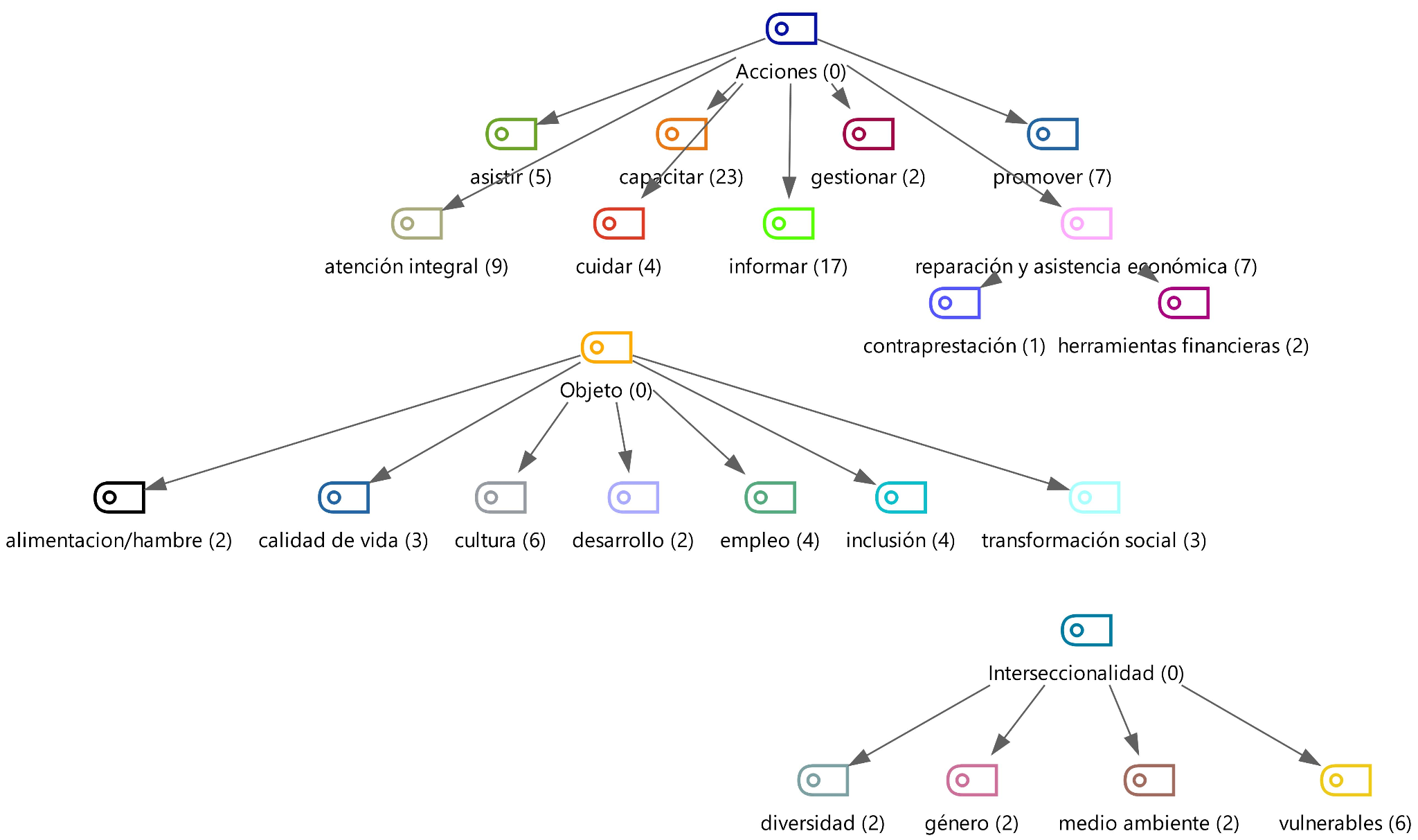En esta visualización se ponen de relieve las categorías emergentes en el resumen narrativo de los programas, las que permiten obtener una aproximación general de la visión gubernamental referida al desarrollo social y el bienestar. Las acciones se reflejan con matices verbales, en cuanto al objeto recupera la finalidad de los programas, y a través del concepto de interseccionalidad se procura reconocer en qué medida los atravesamientos de género, diversidad cultural, étnica, sexual y otras vulnerabilidades son recogidos en los discursos programáticos.