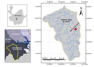 Para el estudio del potencial de lixiviación del Clorpirifos, se ubicó la zona de experimentación en un Entisol, localizado sobre la microcuenca Fray Juana, quebrada El Hato la cual alimenta el embalse Riogrande II. El sitio específico se ubica en la Hacienda La Montaña, Municipio de San Pedro de Los Milagros. El lote escogido se encontraba en barbecho por más de un año lo que garantizó que el área no estuviera en contacto con el plaguicida durante ese periodo, Figura 1. Las coordenadas del sitio son: X = 75,54213° N - X´= 75,54225° N y Y= 6,45056° E - Y´= 6,45061° E.