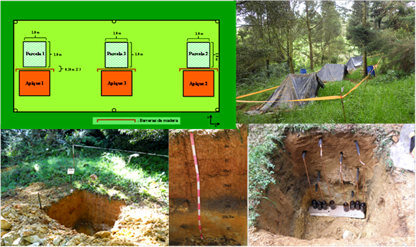 Una vez seleccionada el área se delimitó una zona de 63,25 m2 (13,90 m de longitud y 4,55 m de ancho) (Figura 2). Allí se excavaron tres apiques separados entre sí 4 m y ubicados perpendicularmente a la dirección de la pendiente del terreno, y con unas dimensiones de 1,5 m de largo x 1,0 m de ancho y 1,8 m de profundidad (hasta tocar roca).