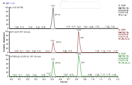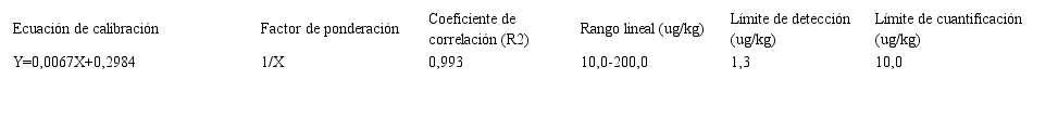 Un resumen del desempeño analítico del método con respecto a los parámetros: linealidad, calibración y sensibilidad se presenta en la Tabla 1. Se realizó una regresión lineal ponderada como medida remedial para controlar la heterocedasticidad que presenta el modelo de regresión lineal simple, lo que le dio más peso a la zona de menor varianza (niveles bajos de la curva) y menos peso a los niveles con mayor variabilidad, niveles más altos de concentración (Edgerley, 1998; Lavagnini y Magno, 2006). La precisión se evaluó a través del estudio de la repetibilidad instrumental y la repetibilidad del método. El coeficiente de variación del instrumento para CPF en rango bajo (10,0 ug CPF/kg) siempre se encontró por debajo del 6% (CV (%)=5,58%). La repetibilidad y exactitud del método se probó en un nivel de concentración, 200,0 ug/kg y se obtuvo un coeficiente de variación del 9,75%. El resultado del estudio de la exactitud de la metodología analítica a través de porcentaje de recuperación a dicha concentración fue del 76,41% de CPF.
