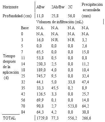 En la Tabla 2, se presentan los volúmenes de agua percolada a lo largo del Perfil N° 2, donde la mayor infiltración se aforó en el lisímetro ubicado en el horizonte más superficial. A los 25 días de muestreo se presentó en el primer horizonte el mayor volumen de infiltración reportado para este perfil (745,7 mL) y aunque no se presentó de forma coincidente con el tiempo de mayor precipitación (t = 70 d), éste si se da luego de un periodo de siete días con lluvias donde se alcanza a acumular una lámina de agua de 42,8 mm. Nótese que en el lisímetro ubicado a 56,0 cm de la superficie concuerda el mayor volumen de infiltración con la lámina más alta de agua precipitada.