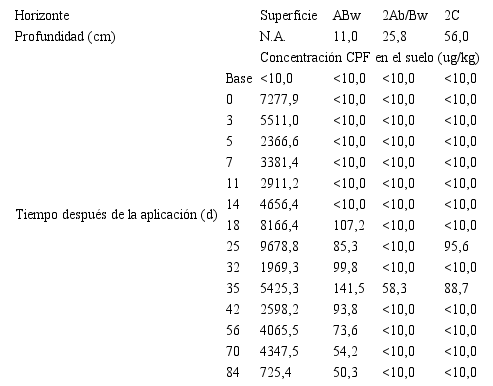 En la superficie del suelo se observa la presencia de CPF en altas concentraciones durante todo el periodo de estudio (84 días), lo que habla de su persistencia en un Entisol bajo cobertura de pastos (Tabla 3). Solo hasta los 84 días empieza a verse un decaimiento de su concentración (725,4 ug/kg).