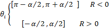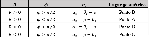 [11]donde ρ es el ángulo del vector normal, αi el ángulo del rayo incidente y αt el ángulo entre el rayo refractado con respecto al Eje Óptico (EO) (Thompson, 2001). La Figura 6, ilustra cuatro situaciones de intersección para el cálculo del ángulo de refracción θt. Dos situaciones se presentan cuando el rayo entra en la región de la lente, una a cada lado del eje óptico, e igualmente cuando el rayo sale. Éstas son presentadas en función del radio de curvatura y la inclinación respecto al eje óptico del vector incidente, de la manera como se plantea en la Tabla 1.