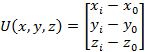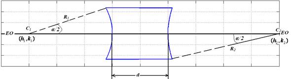 Así la lente es parametrizada en términos de la localización del vértice de la primera superficie los radios de curvatura el grueso de la misma y un índice de refracción asociado a la región acotada entre los radios de curvatura separados una distancia d. En ésta, las coordenadas cartesianas de los puntos de cada superficie curva, satisfacen las ecuaciones (1), (2) y (3) (Lehmann, 1989).
