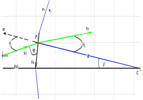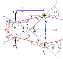 Los ángulos de incidencia y de refracción son transformados al sistema de referencia fijado por el eje óptico. En la descripción geométrica exhibida en la Figura 5, se observan las relaciones angulares descritas en la ecuación (11).