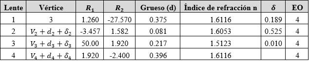 El acople de las lentes es establecido por el vértice de la primera superficie, los radios de curvatura R1 y R2, el grueso d, el índice de refracción n, y el eje óptico (EO), en orden sistemático y sucesivo para su localización en el sistema. La tabla 2 presenta el arreglo matricial del dispositivo Tessar (Hetch, 2005) ilustrado en la Figura 7 compuesto por cuatro lentes ordenados secuencialmente sobre el eje óptico en la dirección de x. En la matriz, las lentes son ordenadas en filas y ordenadas en una secuencia que inicia de la parte superior de la matriz. Los parámetros de la segunda lente están en la segunda fila y así en sucesión hasta el final de la tabla. La primera columna presenta el valor de la coordenada x del vértice de la primera superficie de la lente, la segunda columna contiene el valor del radio de curvatura de la primera superficie, R1, la tercera columna contiene el radio de la segunda superficie R2; en la cuarta columna, el valor del grueso de la lente, la quinta contiene el índice de refracción n. El parámetro δ denota la distancia de separación entre el vértice de la segunda superficie con el vértice de la primera superficie del lente a continuación y la última columna indica la coordenada y del eje óptico.