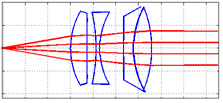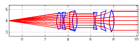 En la segunda, el dispositivo Tessar, descrito matricialmente en la tabla 2, es expuesto gráficamente en la Figura 10. El sistema puede verse como una fuente puntual de luz que se propaga de izquierda a derecha atravesando un sistema óptico, generando a la salida de este un conjunto de rayos que se propagan hacia el infinito en forma paralela.
