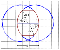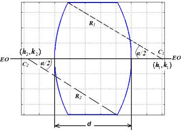 En términos geométricos, la lente se acota por la superficie que denota el conjunto de puntos asociados a parámetros que describen su forma y posición sobre el eje óptico. Esta superficie es parametrizada mediante por un índice de refracción, n, encerrado entre dos superficies curvas con radios curvatura, R1 para la primera superficie y R2 para la segunda, cuyos vértices están separados por una distancia d que determina el grosor de la lente (Thompson, 2001). El parámetro α es asociado al ángulo visual que determina la dimensión de la pupila de la lente (Gómez González, 2012), esta descripción es ilustrada en la Figura 1.