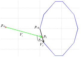 El punto de incidencia del rayo con la lente es calculado mediante la intersección de dos vectores. Uno de ellos, el vector Vs, es tangente a la superficie de la lente con el origen en pv2 como se escribe paramétricamente en la ecuación (7) , es construido por dos puntos sucesivos del conjunto de puntos que definen la lente, planteado en la sección I. EL otro vector Vi con origen pv1, descrito paramétricamente por la ecuación (8) (Mortenson, 1999) representa al rayo incidente como lo muestra la Figura 4.