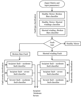 This classifier uses three support vector machines that classify data into one of three possibilities: 1) incipient broken bars fault, 2) moderate broken bars fault, 3) severe broken bars fault. This classifier uses Crest factor, Mean, Entropy and PSC/NSC ratio as features.
