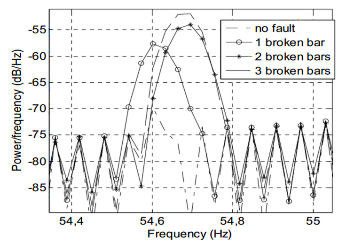 (Thompson, 1994) describes the rotor’s broken bar fault mechanism as consequence of high starting currents, which produce mechanical and thermal fatigue in the cage bars. In addition, heavy-duty cycles and long starting times increase the incidence of breakages in the bar-ring junction region. The model for this type of fault (See Equation 1) represents the fault related sidebands that appear once there is a broken bar fault:
