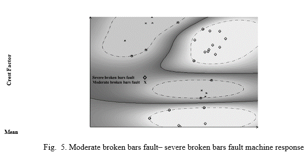 This machine also uses Mean, and Crest factor as features (see Table 3). The machine response in a two dimensional graphic is showed in Fig. 5 with Mean (abscissa) and Crest factor (ordinate) as features.