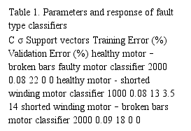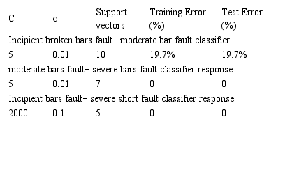 In order to exploit the original data set in the training and validation procedures a random set of 50% of the data set was used in the training algorithm and the rest in the validation algorithm. Then, the data were crossed and the algorithm performance is assessed averaging the two results of the algorithms, in terms of error and support vectors. Two folds were used in order to establish a tradeoff between the generalization capability of each classifier and the limited training data. It is important to mention that in this work, the induced levels of shorted windings were labeled according to a specific severity level. Thus, 2% of shorted winding corresponds to an incipient fault; 5% shorted winding correspond to a moderate fault. Finally, 10% shorted winding corresponds to a severe fault. The same labeling scheme was used for broken bar fault severity classification; 1 broken bar corresponds to incipient fault, 2 broken bars corresponds to moderate fault and 3 broken bars corresponds to severe fault.