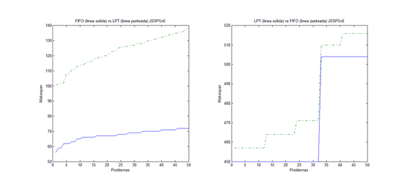 En cada una de las anteriores Figuras 1, 2 y 3 se observa que en la definición de los problemas existe una diferenciación marcada, dado que sus tiempos totales de proceso (makespan) se encuentran separados, pudiéndose decir que pertenecen a clases diferentes. En los pasos siguientes 2 y 3, se determinaron la funciones bayesianas para cada una de estas clases, aspecto que facilita la interpretación de los resultados en una posterior fase de validación.
