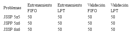 b) Conjunto 2 (validación): En este conjunto se definieron 300 problemas Job Shop: Open Shop, organizados de forma similar a los problemas definidos en la fase de entrenamiento. La generación de todos los problemas se hizo de forma aleatoria.