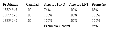 Como se demostró en la Tabla 3, el porcentaje de aciertos (veces en que el clasificador determinó de forma previa la regla de prioridad más adecuada) fue del 96%. No obstante, este porcentaje puede variar según la naturaleza de los mismos problemas.