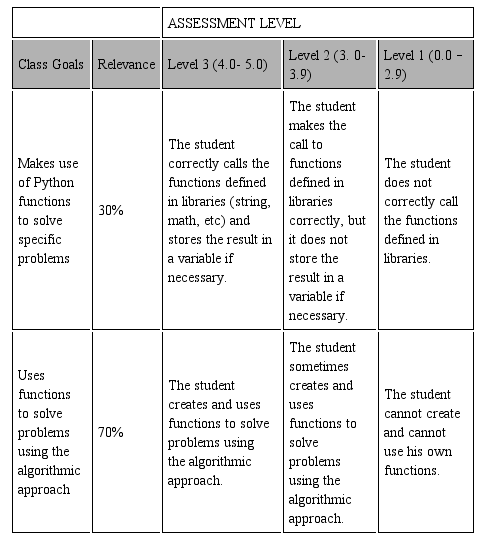 Assessment also is an important part of a teaching programming course because it helps students and professors to review the process to enhance students’ learning. Rubric is a scoring tool that lists the criteria for a specific assignment and it describes the levels of quality for each criterion. Using rubrics with detailed explanations of an assignment and its assessment, can assist students in improving their performance. Rubrics provide students with a much clearer picture of the kind of performance that is expected from them and the requirements under which they will be assessed. Therefore, in our approach, assessment rubrics for each activity were presented and explained to the students in advance. An example is shown in Table 1.
