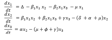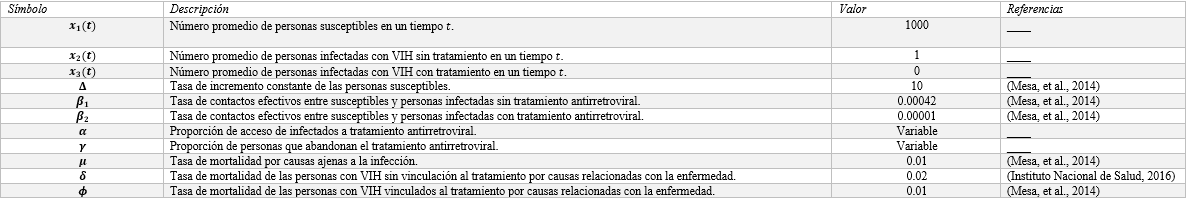 En la formulación del modelo, se asume que la población humana se encuentra dividida en tres categorías o subpoblaciones, que corresponden a (i) personas susceptibles de adquirir el virus; es decir, personas que son sexualmente activas en un rango de edad de 15 a 25 años y que podrían, eventualmente, entrar en contacto con personas infectadas; (ii) personas infectadas con el virus pero que no están en TAR, bien sea porque no han sido diagnosticados, porque no han iniciado el tratamiento, o porque han decidido abandonarlo. Finalmente, (iii) personas infectadas que se encuentran en TAR.