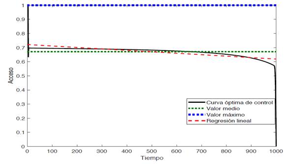 En la Figura 7 se observa que la dinámica de la línea promedio y de la regresión lineal, varían de forma cercana a la curva óptima, haciendo que ellas se encuentren por encima y por debajo de la misma; es por esto que se podría considerar alguna de estas curvas como sustituta aceptable del control óptimo, al momento de no poder considerar la curva óptima como medida de control.