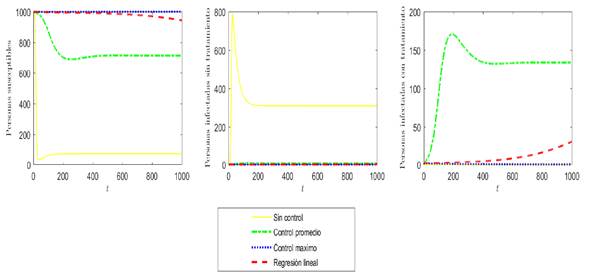 Por último se observa que el control por medio de la regresión lineal, al igual que las otras estrategias subóptimas refleja que la cantidad de infectados sin acceso efectivo al tratamiento antirretroviral tiende a niveles muy bajos, generando así que la enfermedad sin importar la estrategia subóptima utilizada tenga buenos beneficios para la población infectada; si se observa la Figura 6, la cual muestra curvas óptimas, y la Figura 8 se podría afirmar que existe gran similitud en la dinámica de las diferentes poblaciones, por lo cual las medidas subóptimas constituyen una medida de control eficiente.