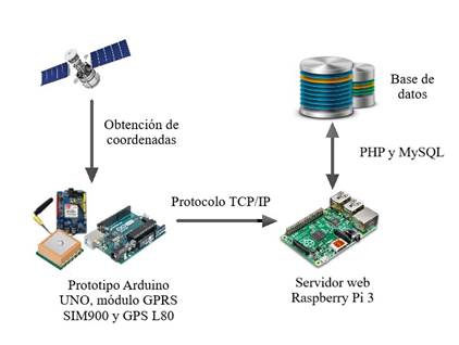 Los dispositivos que hacen posible el funcionamiento del sistema se enuncian y explican a continuación: primeramente, el proceso de obtención de datos se realiza por medio de un módulo GPS L80, cuyo propósito es obtener la información sobre la ubicación del vehículo, por medio de la triangulación con los satélites a los cuales se conecta el dispositivo; una tarjeta Arduino UNO, encargada de tratar la información proporcionada por el GPS para transmitirla a través de Internet y un módulo GPRS SIM900, que a través de datos móviles e instrucciones programadas mediante comandos AT es usado para enviar las coordenadas geográficas a través del protocolo TCP/IP por medio de una petición GET utilizando HTTP.