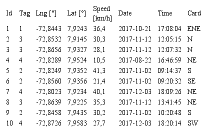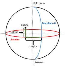 Los datos de posicionamiento geográfico dentro del globo terrestre, necesarios para la localización de un objeto son la longitud y la latitud, las cuales son medidas teniendo en cuenta el meridiano de Greenwich y la línea del Ecuador respectivamente, tal como se detalla en la Figura 2. A su vez, para garantizar la monitorización en tiempo real del movimiento, posición y trayectoria son necesarios como mínimo el curso, la velocidad, la fecha y la hora del dispositivo en cada lectura realizada.