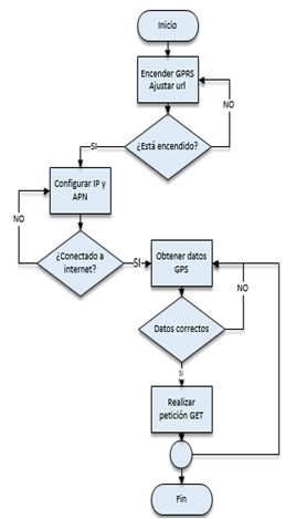 El algoritmo que describe de forma general el funcionamiento del programa en Arduino se presenta en la Figura 3, donde se realiza el encendido del GPRS por medio de pulsos digitales, luego de verificar si éste se encuentra apagado, para proseguir con la asignación de IP y APN para luego obtener los datos del GPS y enviarlos por medio de una petición GET a través de Internet.