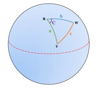 En la Figura 6 se presenta la ley de estados Haversinos, en donde se considera un triángulo en la superficie esférica con vértices u, v y w; mientras que a, b y c corresponden a las distancias a ser calculadas con la aplicación de las leyes de Haversine. Para el caso de la Tierra, las longitudes de a, b y c son iguales a su ángulo central multiplicado por el radio terrestre. La Ecuación (2) muestra la relación entre las distancias y ángulo delimitados por el triángulo u, v, w.