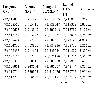 En la Tabla 2 se muestran algunas de las pruebas de precisión realizadas con el prototipo. Las primeras columnas corresponden a los datos obtenidos desde el GPS, mientras que las siguientes hacen referencia a las coordenadas adquiridas mediante el navegador web. Los valores de longitud (-72,518055) y latitud (7,911825) presentados en la Figura 5, junto a los valores obtenidos mediante pruebas de funcionamiento se observan en la primera fila de la Tabla 2.