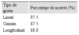 El trabajo desarrollado en el área del procesamiento digital de imágenes en pavimentos utilizando técnicas de inteligencia artificial se ha basado en su mayoría en la detección de grietas o fisuras, un ejemplo de este es el trabajo desarrollado por Lijun Sun, Guobao Ning y Shengguang Tan (Sun et al. 2014) donde se propone un modelo de detección de grietas en diferentes estructuras de pavimentos para evaluar la condición de una vía utilizando una red neuronal con el algoritmo de back propagation. En la metodología del trabajo, primero se realiza el mejoramiento de la imagen, a partir de la corrección del histograma y después se segmentan las diferentes fisuras que serán clasificadas por la red. La red neuronal previamente entrenada define si la grieta es lineal o piel de cocodrilo. Después si la fisura es lineal, la misma red la clasifica entre longitudinal o transversal, determinando el ángulo de inclinación con respecto a la horizontal. La tabla 6 muestra los resultados obtenidos con 40 imágenes.