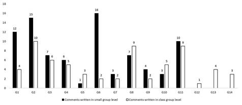Sixty five comments were written by the students when they participated in class groups. The maximum number of comments written in class group level was 10. These comments were made by students from the G2 work group. Only one comment was written into the G12 group. Students who belonged to the work groups G2, G8 and G11 participated in an active manner. Ten comments were submitted by students from G2 group and nine comments by students from G8 and G11 groups. The Figure 10 presents the results of the comments wrote by the students in both collaborative levels.