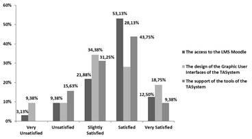 The results of the individual questionnaires answered by the students showed that the maximum levels of the students’ satisfaction were: satisfied and slightly satisfied. On one hand, 53,13 % and the 43,75 % of the students felt satisfied with the access to the TASystem embedded into the LMS Moodle and the TASystem tools support respectively. On the other hand, 34,38 % of the students felt slightly satisfied with the TASystem graphic user interface design. This led us to conclude that most of the students felt pleased using the TASystem into the LMS Moodle. The Figure 11 presents the results of the students’ satisfaction level.