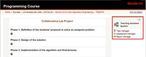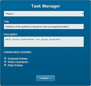 The TASystem (Echeverria, 2017) is a platform developed by supporting the design of the collaborative learning activities into the LMS Moodle. The TASystem is composed by three interconnected tools as follows: i) The Task Manager, ii) The Assessment Manager and iii) The Report Manager (Echeverría et al., 2017). The Figure 1 presents a screenshot with the TASystem in Moodle.