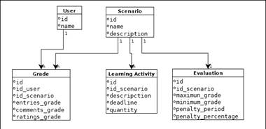 With the aim to integrate the mentioned modules to the Moodle database, one data model was created. This model and the general architecture of the TASystem allow using these modules individually. The Figure 3 presents the data model of the assistant as an UML (Unified Model Language) entity-relationship diagram. This model contains five interconnected entities: User, Scenario, Grade, Learning Activity and Evaluation.