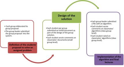 During the Collaborative Lab Project the students were organized in groups and they had to participate in three collaborative learning scenarios: 1) Definition of the students’ proposal to solve an assigned problem, 2) Solution design and 3) Implementation of the algorithm and final presentations. The Figure 6 presents the workflow in the Collaborative Lab Project.