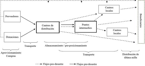 Con el aumento del impacto y la frecuencia de los desastres, las organizaciones humanitarias se han convencido del papel estratégico de la logística, y han comenzado a mejorar sus niveles de integración a través del desarrollo de capacidades de comunicación y del diseño de cadenas de suministro humanitarias (Vega y Roussat, 2015). En este sentido, Day, et al. (2012) definen la cadena de suministro humanitaria como el sistema responsable de gestionar los procesos logísticos en el manejo de desastres, así como la evaluación, integración y coordinación de los actores involucrados en el sistema. Las cadenas logísticas humanitarias siguen los objetivos de entregar los suministros de ayuda tan rápido como sea posible, minimizar las pérdidas de vidas y aliviar el sufrimiento humano (Krishnamurthy, et al., 2013). En la figura 1 se presenta un esquema general de la cadena de suministros en el contexto de la logística humanitaria, considerando el suministro inicial de los proveedores y donantes, el transporte entre los centros de almacenamiento y la distribución de la ayuda humanitaria a los beneficiarios en las zonas afectadas por el desastre.