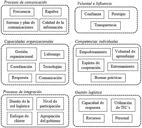Es evidente que los factores de influencia en la coordinación inter-organizacional encontrados en la literatura no son pocos y son diversos. No obstante, es importante reconocer que ellos presentan alguna relación con las capacidades organizacionales en términos de gestión y recursos físicos: la transparencia, el personal calificado, el liderazgo, las herramientas tecnológicas, el uso de tecnologías de comunicación y sistemas de comunicaciones, no solo favorecen a la organización de forma individual y le brinda fortaleza y empoderamiento para responder efectivamente a un desastre, sino que también estos ofrecen mayor capacidad y posibilidad de integración y coordinación con otros elementos involucrados en la cadena logística humanitaria. Dada la diversidad de los factores encontrados, la figura 3 ha sido diseñada con el fin de agrupar ordenadamente los factores de influencia en la coordinación propuestos en la literatura, en función de las capacidades organizacionales, competencias individuales, capacidades individuales, influencia, integración y gestión logística.