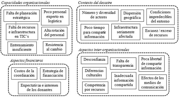 Elaboración propia.La manera en que son clasificadas las barreras a la coordinación que se muestra en la figura 4, puede ser de gran utilidad a las organizaciones que conforman la cadena de suministros humanitaria. Esto puede ayudar a identificar las causas de problemáticas puntuales, o dificultades en actores específicos y a partir de entonces, se podrá definir un esquema de prioridades que le permita a los actores involucrados adelantar medidas de forma preventiva buscando reducir las posibilidades de enfrentar los mayores problemas e ineficiencias en las operaciones de atención a los desastres, como la duplicación de esfuerzos, el desperdicio de recursos y el bajo nivel de cobertura en la respuesta. Por tanto, la reducción de estos riesgos y la detección oportuna de estas barreras podrá favorecer el logro de los objetivos fundamentales definidos en la logística humanitaria: la reducción del sufrimiento humano y del número de víctimas que dejan la ocurrencia de los desastres.