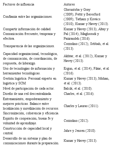 Por otra parte, se han encontrado distintos factores que influyen favorablemente y facilitan la coordinación inter-organizacional dentro del contexto de la logística humanitaria. La tabla 1, que se muestra a continuación, presenta un resumen de los factores propuestos por distintos autores en la literatura.