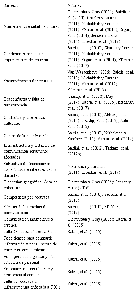 Clasificación de las barreras de coordinación en la logística humanitaria.