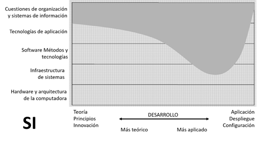 (The Association for Computing Machinery (ACM); The Association for Information Systems (AIS); The Computer Society (IEEE-CS), 2005)Según el Informe, la ASI se ocupa de propuestas teóricas y prácticas y no se interesa por el hardware y la arquitectura de computadores; en el terreno de lo práctico, estudia en menor medida la infraestructura de sistemas y en mayor los métodos y tecnologías de software y las tecnologías de aplicación; y su ámbito de desarrollo pleno se da sobre aspectos organizacionales y sistemas de información.
