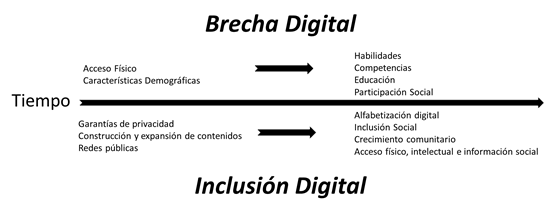 Es importante hablar inicialmente de la brecha digital, ya que ésta se establece, antes que la inclusión digital, en el campo práctico y teórico: la problemática de la brecha digital da origen a una serie de procesos para reducirla en el marco de la posterior inclusión digital.