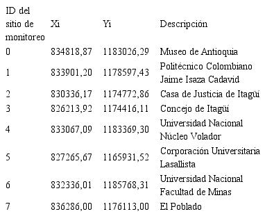 La metodología se aplica en el área metropolitana de la ciudad de Medellín y se toma como variable de estudio la concentración promedio mensual de PM2.5 (µg/m3), disponible de la Red de Calidad del Aire (RedAire) en ocho sitios de monitoreo en los años 2013 y 2014 (Sistema de Coordenadas Geográficas MAGNA Colombia Bogotá y proyección Transversade Mercator) (RedAire, 2015). Se tomaron como posibles variables explicativas a latemperatura (T en °C), la velocidad del viento (Vv en m/s), el gradiente espacial de T (∇T) y el gradiente espacial de Vv (∇Vv). Los datos de las dos primeras del Sistema de Alertas Tempranas del Departamento de Antioquia (SIATA, 2016) y las dos últimas se calculan con técnicas de análisis espacial. Los datos fueron medidos en los sitios de monitoreo de la Tabla 1. La superficie de la región en donde se hicieron las mediciones es de 535,13 km2, que corresponde a una densidad de muestreo de 66,89 km2/sitio de monitoreo.