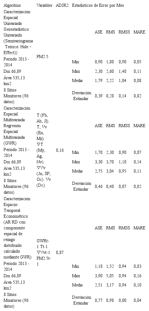 Con la caracterización espacial univariada se encuentra que el modelo HoleEffect es el que tiene mejor desempeño para PM2.5. En la caracterización espacial multivariada, el algoritmo GWR mostró buen desempeño en la estimación de la concentración. Se encontró que las variables explicativas fueron la velocidad del viento y la temperatura, siendo muy importantes los gradientes espaciales de estas variables. Este hallazgo es un aporte toda vez que en la literatura no se reporta su aplicación. Para la caracterización espacio–temporal, se encontró que el modelo de mejor desempeño fue un AR-RD de rezago 1 con GWR como variable explicativa que logró explicar la variabilidad espacio-temporal de la concentración de PM2.5 en un 87%. Las variables explicativas más significativas fueron: el dominio espacial calculado con GWR, el gradiente de la velocidad del viento, la temperatura y la concentración del material particulado. Al comparar los resultados de los modelos con el modelo AR, la variable más importante fue el rezago 1 de la concentración del material particulado. Las demás variables sólo aportaron un 1% de más a la variabilidad.