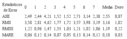 Tabla 4 Estadísticos de Error de Estimación de PM2.5 por sitio de monitoreo.Analizando los valores de la concentración promedio del contaminante en los sitios de monitoreo (Tabla 5), se infiere que la zona más contaminada de la ciudad está entre los sitios de monitoreo 0 (Museo de Antioquia) y 4 (Universidad Nacional Núcleo Volador), que la zona menos contaminada de la ciudad está entre los sitios de monitoreo 1 (Politécnico Colombiano Jaime Isaza Cadavid) y 7 (El Poblado), y que la zona con una contaminación tendiente al valor promedio anual está en los sitios de monitoreo 3, 5 y 6 (Corporación Universitaria Lasallista – Municipio de Caldas).
