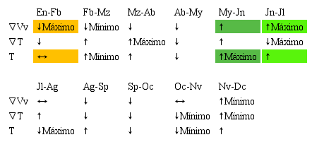Tabla 6 Comportamiento intermensual de las variables ∇Vv,∇T y T.Con base en los resultados de la Tabla 6, se encuentran los siguientes patrones: