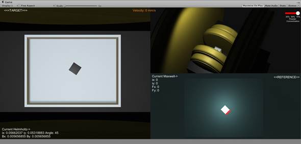 El comportamiento magnético del micro robot se modela a partir de dos scripts en C#, para el torque y la fuerza magnética presente, que corren simultáneamente. En la escena se presentan indicadores de las variables utilizadas en el sistema, leídas directamente de dichos scripts. Por último la variable de salida (velocidad) se almacena en un documento de texto para su análisis posterior. La escena queda dividida en tres cámaras (figura 4), a la izquierda el comportamiento del micro robot, a la derecha arriba la vista general del sistema y a la derecha abajo la referencia u orientación. El control del sistema se realiza con un joypad, aunque también es posible utilizar el teclado.